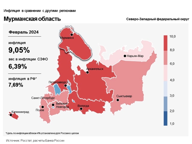 Годовая инфляция на Северо-Западе в феврале 2024 года ускорилась до 7,45% после 6,98% в январе. Это по-прежнему ниже, чем в целом по России (7,69%). Главная причина роста цен в макрорегионе – высокая потребительская активность, которая превышает возможности увеличения предложения товаров и услуг.