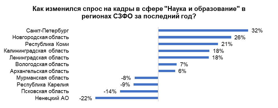 Между тем в регионах СЗФО наибольший прирост вакансий в сфере науки и образования за последний год произошел в Петербурге (работодатели стали на 32% чаще искать кадры в образовании), Новгородской области (+26%) и Коми (+21%). А вот в Мурманской, Псковской области, Карелии и НАО, наоборот, число вакансий в образовании и науки стало сокращаться.