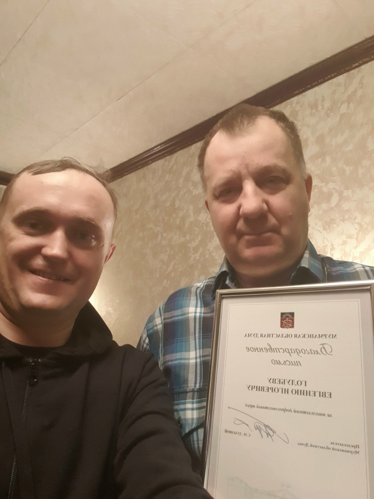 8 февраля Александр Викторович вручил благодарственное письмо Мурманской областной Думы ветерану боевых действий в Афганистане Евгению Игоревичу Голубеву.