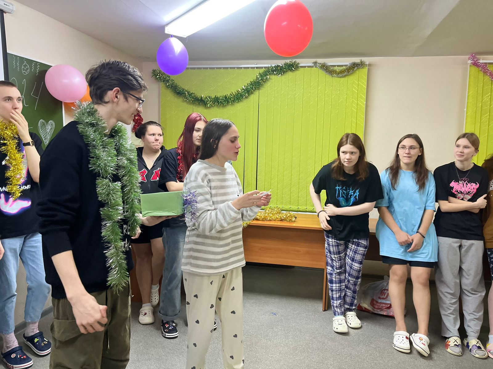 24.12.24 г. состоялось новогоднее вручение призов по конкурсу «Самая лучшая комната». Ребята, проживающие в комнатах 40, 70, 113, 145 получили грамоты и сладкие призы. Присутствовавшим было предложено поучаствовать в новогодней викторине, отгадать название фильмы по слайдам, собрать новогодние пазлы. Ребят поздравила с Новым Годом озорная Снегурочка. Пожелала студентам хороших каникул, успешной сдачи сессии. В заключении мероприятия провели хоровод, спели песню «В лесу родилась елочка» и получили сладкие сюрпризы.