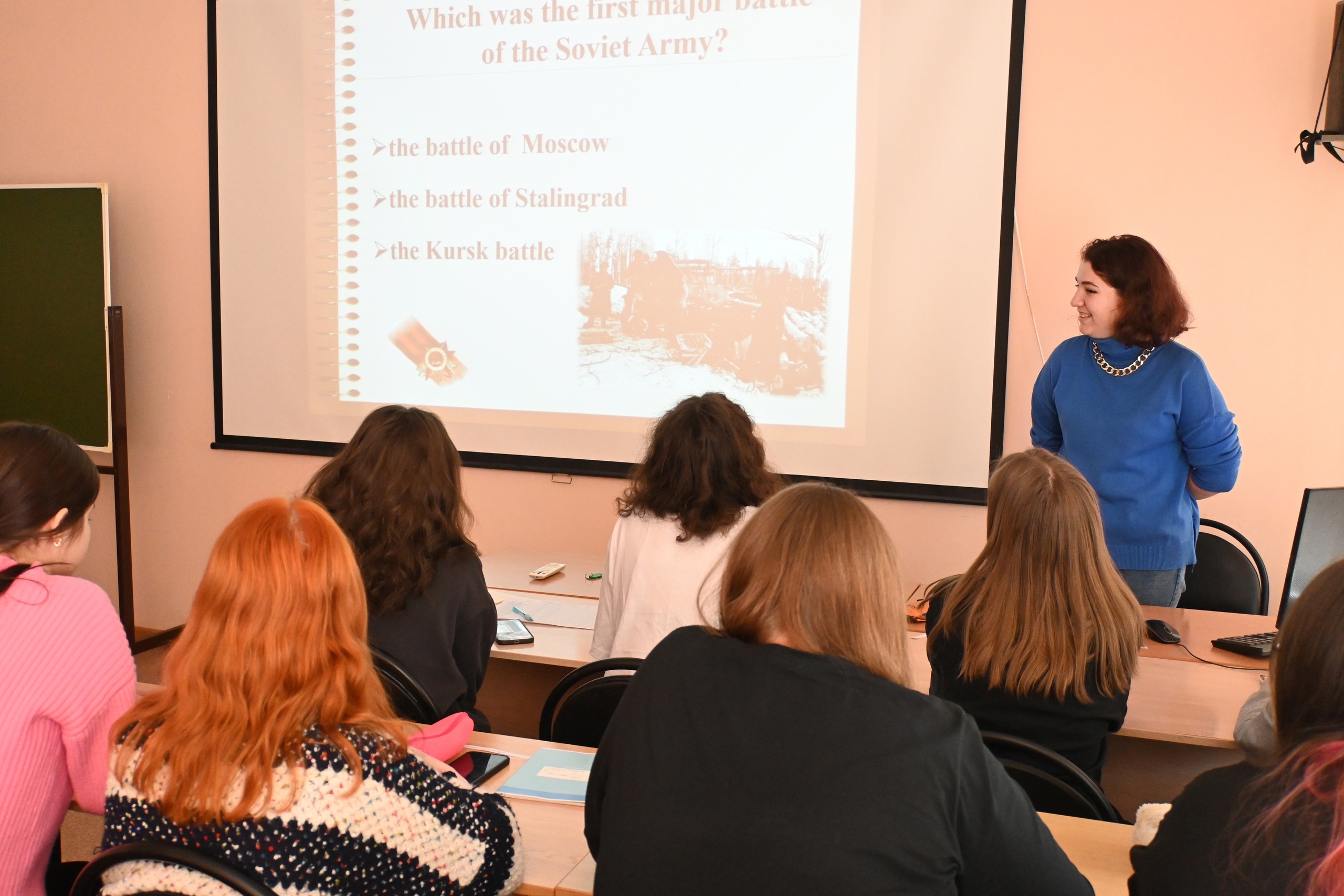 8 мая в Северо-Западном институте (филиале) АНО ВО МГЭУ состоялось открытое занятие по английскому языку " Помнит сердце, не забудет никогда" в группе 1 курса колледжа, которое провела специалист молодёжного центра "СОПКИ" Щетинская Альбина Анатольевна. В преддверии празднования Дня Победы, студенты в формате викторины на английском языке оживили героические страницы военной истории: основные сражения, названия городов-героев, вспомнили величайших полководцев и простых солдат, кто внес неоценимый вклад в дело Великой Победы. Открытое занятие организовала преподаватель английского языка Нерадовская Светлана Сергеевна.