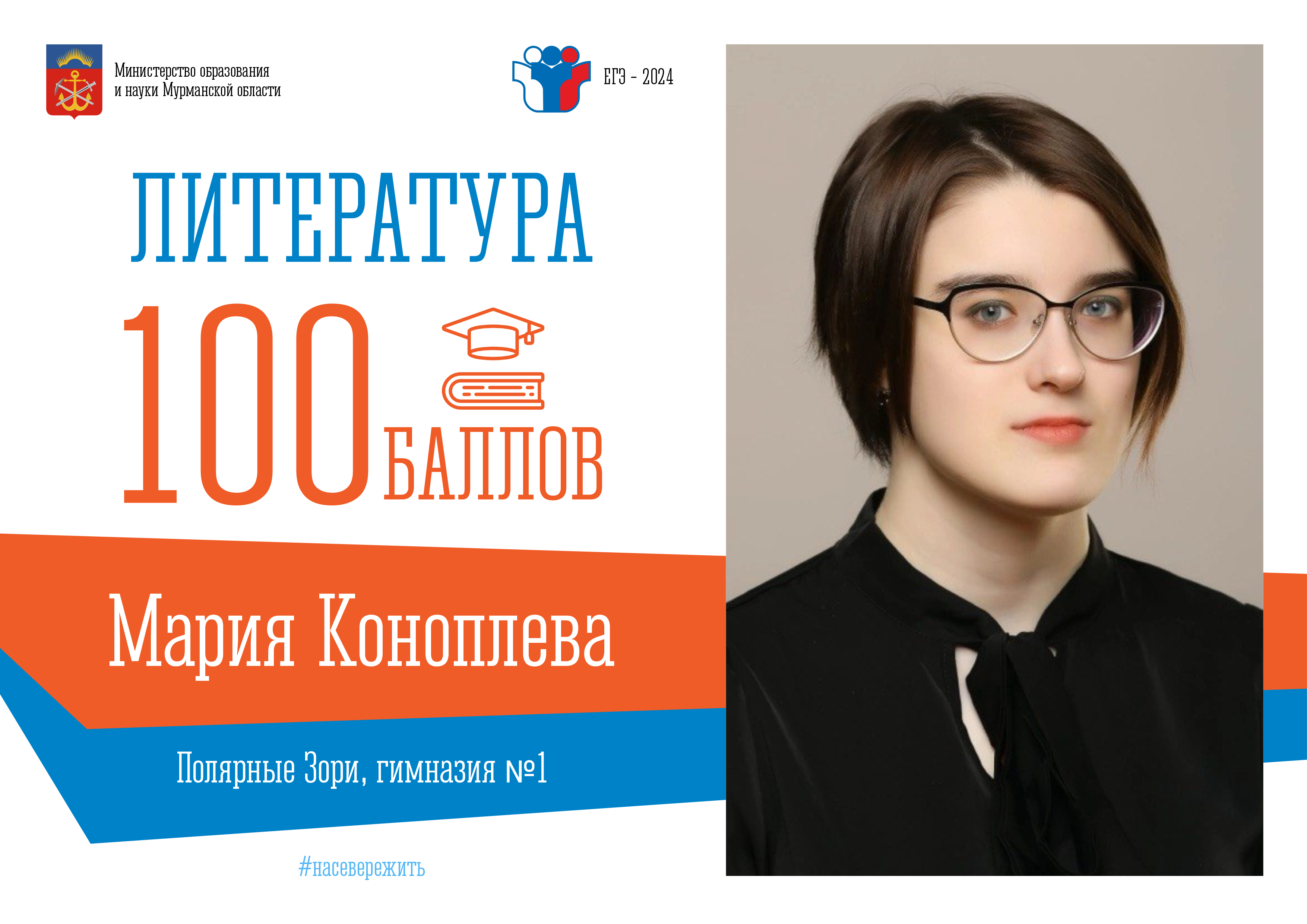 Мария Коноплева окончила гимназию № 1 в г. Полярные Зори. Серьезно занималась гуманитарными предметами, и результаты единого государственного экзамена тому подтверждение. 100 баллов по литературе, 94 – по английскому языку, 81 – по русскому языку, 79 – по обществознанию, «5» – по математике базового уровня – таков итог экзаменационного марафона выпускницы.
