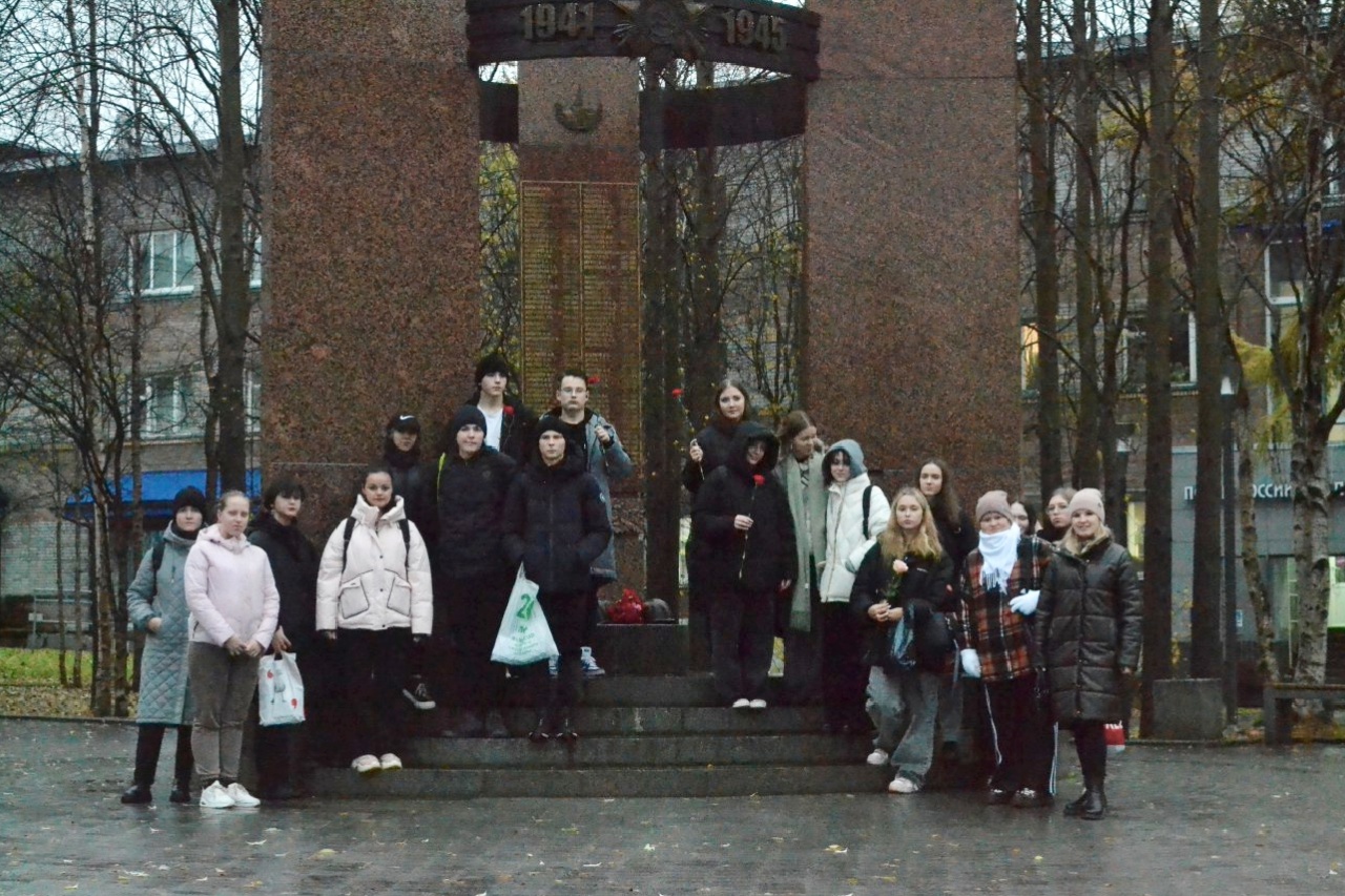 В пятницу, 11 октября, занятие по внеурочной деятельности «На Севере – жить!» было посвящено 80-летию Петсамо-Киркенесской операции. Студенты групп № 11, 16, 18-п, 19-п, 20 совместно с кураторами отправились к Памятному знаку землякам, погибшим или пропавшим без вести в годы Великой Отечественной войны, чтобы возложить цветы как дань памяти павшим.