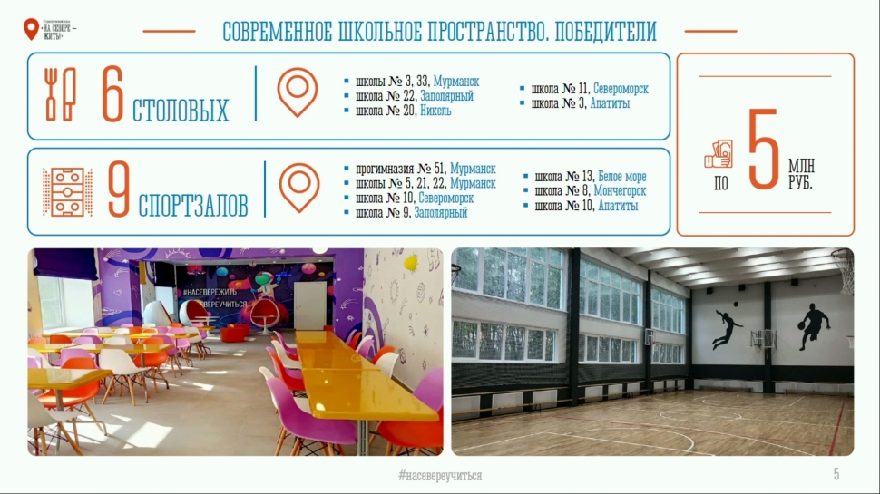 Итак, 5-миллионные гранты получат: североморская школа № 11 - на обновление школьной столовой, школа №10 - на преображение спортивного пространства, школы № 2 и № 5 - на обновление внутреннего (учебного) пространства.