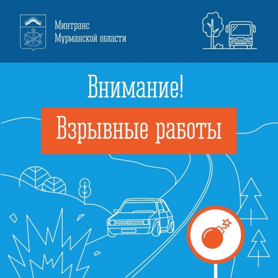 Минтранс Мурманской области информирует: 19, 20 и 21 июня с 10:00 до 12:00 в связи с проведением буровзрывных работ будет перекрываться движение на участке автодороги от д. 114 по пр.