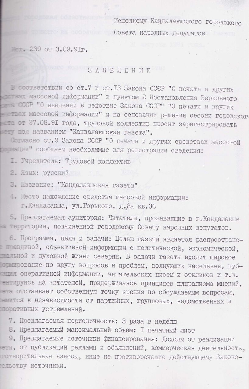 Заявление трудового коллектива газеты «Кандалакшский коммунист» в исполком Кандалакшского городского Совета народных депутатов Мурманской области с просьбой о регистрации нового издания.