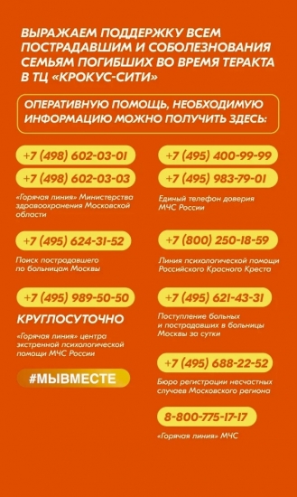 Общероссийская акция взаимопомощи #МЫВМЕСТЕ запустила линию по сбору средств для помощи семьям погибших, семьям пострадавших и пострадавшим вчера при теракте в «Крокус Сити Холл».