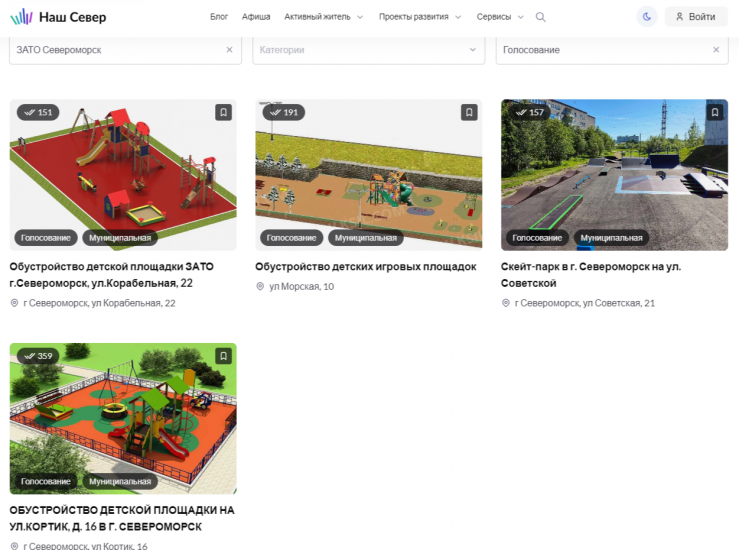 Североморск представлен четырьмя объектами. Это скейт-площадка на ул. Советской и три игровых зоны: на ул. Кортик, 16, ул. Корабельной, 22 и ул. Морской, 10. До 18 февраля каждый житель старше 16 лет может отдать свой голос за понравившийся проект детского или спортивного комплекса.