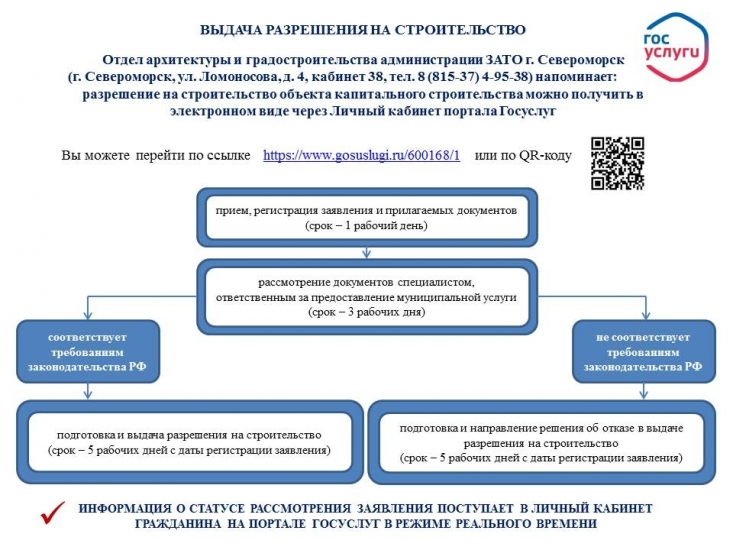 Отдел архитектуры и градостроительства администрации ЗАТО г. Североморск напоминает: получить необходимые услуги можно не выходя из дома - через gosuslugi.ru , в том числе разрешение на строительство объектов капитального строительства - см. фото.