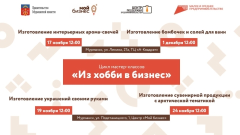 С 17 ноября в Мурманске для жителей и гостей столицы Кольского Заполярья пройдет цикл мастер-классов «Из хобби в бизнес», где действующие предприниматели помогут всем желающим освоить азы новой профессии и расскажут, как монетизировать своё хобби.
