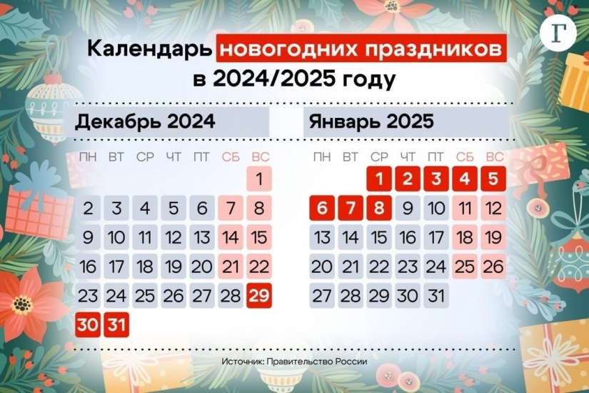 Каникулы начнутся в воскресенье, 29 декабря и продлятся до среды, 8 января включительно. В этом году 31 декабря также будет выходным из-за рабочей субботы 28 числа.