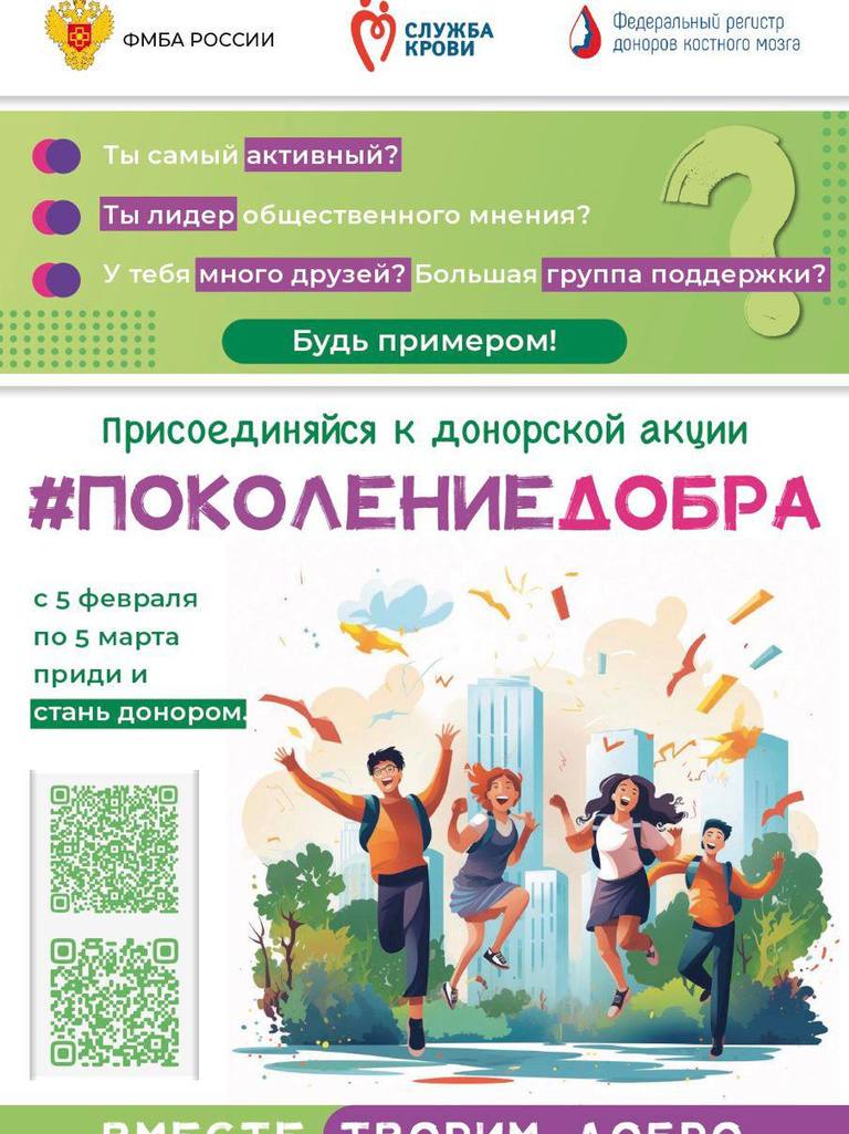 С 5 февраля по 5 марта при поддержке Федерального медико-биологического агентства во всех регионах страны пройдет Всероссийская акция «Поколение добра».
