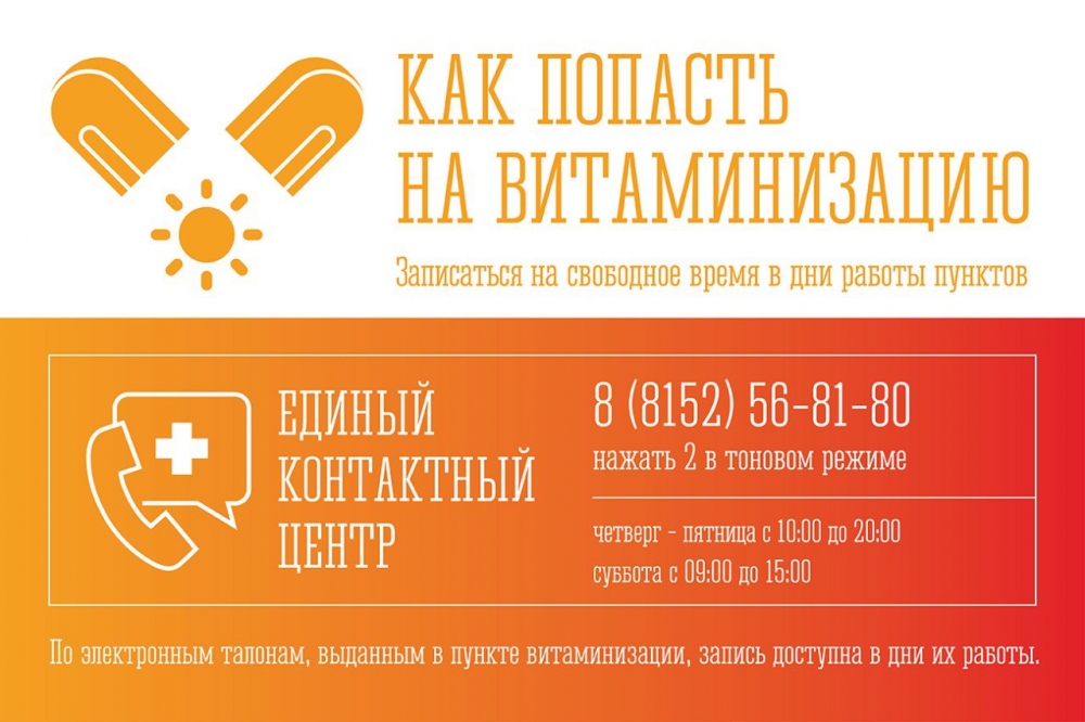 Запись в пункты витаминизации на проведение бесплатного скринингового исследования уровня витамина D в организме доступна в четверг и пятницу с 10:00 до 20:00, в субботу с 09:00 до 15:00 по телефону 8(8152) 56-81-80 (в тоновом режиме набрать цифру 2). Записаться можно на любой из ближайших дней работы пунктов, при наличии свободных талонов. Также в дни работы в каждом пункте витаминизации доступны талоны электронной очереди. В этом случае запись проводится на день обращения.